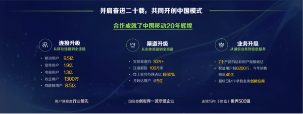 今年是中国移动成立二十周年。通过与合作伙伴二十年的并肩奋进,中国移动已发展成为全球客户规模最大的运营商,实现了从移动连接到全连接的转型升级,各类连接用户超20亿;实现了从实体渠道到全渠道的转型升级,渠道规模超百万、月触达客户超5亿,线上业务办理占比超60%;实现了从通信业务向信息服务的转型升级,有7个产品的活跃用户规模过亿,移动认证月活用户超3亿,权益用户超6200万,年销售额近40亿。二十年来,中国移动长期保持客户满意度行业领先,一直位居《财富》世界500强榜单前列,入选国务院国资委创世界一流示范企业,可以说是开放合作成就了中国移动二十年的辉煌。