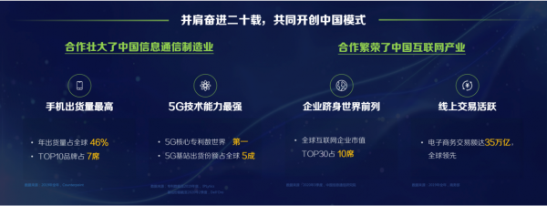 作为基础通信运营商,中国移动积极发挥“扁担效应”,助力信息通信产业上下游企业发展。合作壮大了中国信息通信制造业,目前“中国手机”和“中国5G”已成为新的中国名片,全球TOP10手机中,中国品牌占了 7席,手机年出货量占全球 46%,5G技术专利占全球近 4成。合作也繁荣了中国互联网产业,越来越多的互联网企业,植根于强大移动互联网基础设施土壤,快速成长并走向了世界的舞台,全球市值前30的互联网企业中,中国企业占了10席。中国移动与产业二十年的合作,开创了中国模式,成为合作共赢的典范。