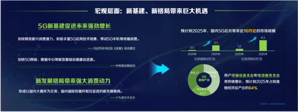 从宏观层面来看,新基建、新格局带来巨大机遇。今年年初,习近平总书记在《求是》杂志撰文要求“加快释放新兴消费潜力,积极丰富5G应用技术场景,带动5G手机等终端消费”。在刚刚结束的十九届五中全会上,中央也提出要加快形成以国内大循环为主体、国内国际双循环相互促进的新发展格局。这给5G发展、终端消费带来了更大空间、树立了更强信心。预计到2025年,国内5G将拉动近10万亿的市场规模,其中终端设备1.4万亿,通信服务0.7万亿。