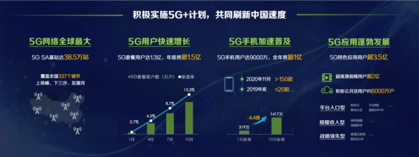 今年也是中国移动5G商用一周年。我们与合作伙伴一起努力,再次加速代际切换,发展出了中国速度。在网络建设方面,中国移动目前已经建成全球最大的5G网络,全国337个城市已基本实现5G SA网络覆盖,开通基站数超过38万站。在客户发展方面,5G套餐客户10个月就突破1亿户,预计年底将超1.5亿。在终端普及方面,合作机型超150款,月销量逐月大幅增长,5G手机用户已达9000万户,年内将超1亿,发展步入了快车道。在应用创新方面,中国移动推出超高清视频、视频彩铃、和彩云、云游戏、云VR等多项5G特色应用,使用客户超过3.5亿,咪咕视频、和彩云等应用已跻身行业第一梯队。