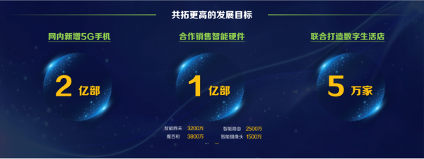 2021年我们将携手合作伙伴,实现网内新增5G手机2亿部、合作销售智能硬件1亿部、联合打造数字生活店5万家。