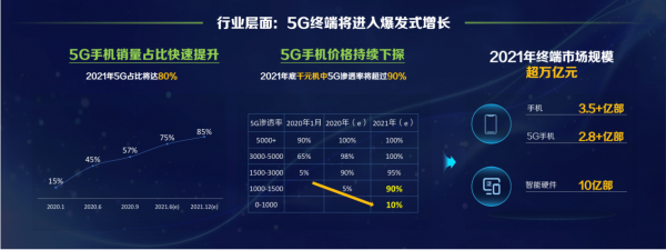 从行业层面来看,5G终端将进入爆发式增长。目前5G手机出货量占比已由年初的15%快速提升已达60%,明年将进一步提升至80%以上。同时,1500元以上档位的产品切换已基本完成,明年,中国移动将携手各位合作伙伴,进一步推动5G手机成本下降,进一步降低用户购机门槛,实现1000元以上机型全覆盖,并积极推进千元以下机型的覆盖。预计明年全行业手机销量超过3.5亿部,其中5G手机超过2.8亿部,手机市场销售规模将超万亿元。明年智能硬件规模也将快速增长,预计个人、家庭、行业等多形态智能硬件销量将达10亿部。