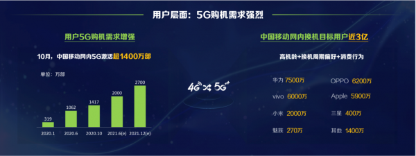 从用户层面来看,客户的5G购机需求较为强烈。这里和大家分享一组数据,过去十年我国人均可支配人均收入翻了一番,但是移动通信支出已经下降至不足2%,人民群众对通信产品和应用有需求,需要我们提供高质量的产品。从我们的调研来看,也是显示越来越多的用户乐意购买5G手机,以刚刚结束的双十一为例,各大主流的电商平台销量TOP机型中,5G机型占比超过90%。从中国移动网内的数据来看,5G终端月激活量已经突破1400万部,预计到明年底,月激活量就将在2700万部以上。此外,目前中国移动网内处于换机周期的目标用户近3亿,我们将携手终端厂家、渠道合作伙伴一起,加快5G发展,满足人民日益增长的对美好数字生活的需要。