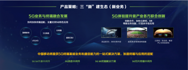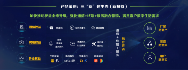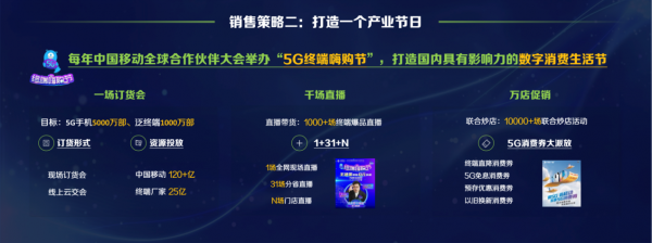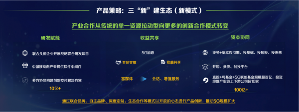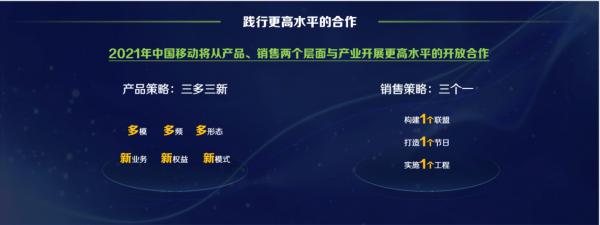 中国移动将从产品和销售两个层面,与产业开展更高水平的开放合作。产品层面策略推出“三多三新”,即多模、多频、多形态,新业务、新权益、新模式;销售策略就是“三个一”,即构建1个联盟、打造1个节日、实施1个工程。