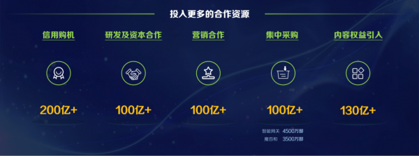 为达成上述目标,中国移动将投入超200亿元的信用购机专项资源,提供超100亿元的研发及资本合作资金,超100亿元的营销合作资源。此外在智能网关、魔百盒等方面的集采规模将达100亿元,各类生活权益及内容引入也将超130亿元。
