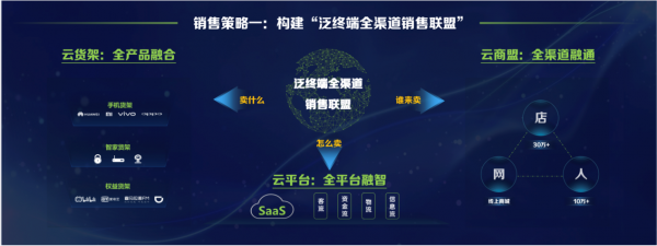 第一个“1”是 构建1个“泛终端全渠道销售联盟”。这个联盟一是解决卖什么的问题,通过打造“云货架”,不断拓宽终端厂商、应用服务提供商的产品种类,满足用户“通信+终端+服务”一体化需求;二是解决谁来卖的问题,通过构建“云商盟”,发挥中国移动渠道合作规模优势,融通“店-网-人”;三是解决怎么卖的问题,通过建设“云平台”,打造一个智慧大脑,实现“客流、物流、资金流、信息流”的汇聚,开展智慧销售、智慧运营。