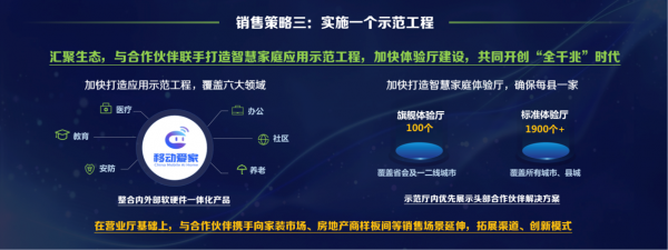 第三个“1”实施一个“智慧家庭应用示范工程”。中国移动将以全千兆为引领,开放业务平台,凝聚头部合作伙伴能力,联合打造智慧家庭应用师范工程,覆盖教育、医疗、安防、办公、社区、养老等6大领域,为客户提供一体化智慧家庭解决方案。中国移动将结合头部合作伙伴的解决方案,在全国打造2000家以上示范厅,一直要覆盖到县城,确保每个县有一个智慧家庭体验厅。未来在营业厅基础上,与合作伙伴携手向家装市场、房地产商样板间等营销场景延伸,共同打造智慧家庭示范工程。