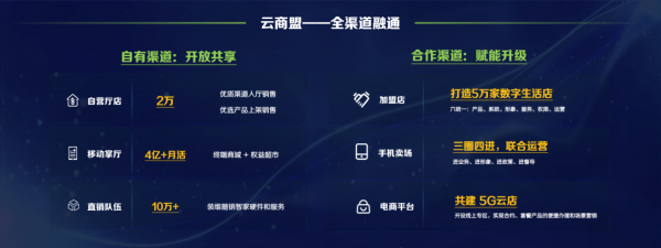 在“云商盟”方面,推进“全渠道融通”。对于中国移动2万家自控物业渠道、4亿月活用户的手机营业厅、10万的装维直销人员,我们将向联盟伙伴敞开销售能力。对于30 多万家合作加盟店,明年我们将优选5万家,通过“六统一”和深度赋能,联合打造数字生活店;对于手机卖场,我们将持续开展“三圈四进、联合运营”,深化与“全国连锁、本地连锁、厂家渠道”的紧密合作;对于电商平台,我们将联合共建5G云店,通过开设线上专区等形式,实现合约、套餐产品的便捷办理和场景化营销。