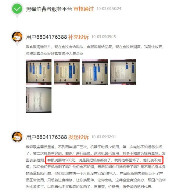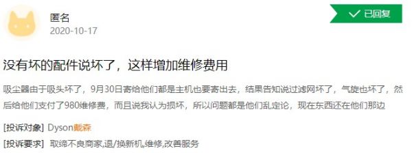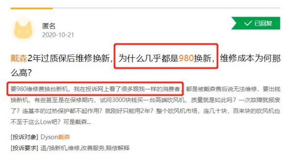 但是买了之后,前面说过除了破损掉漆问题以外,出现最多的投诉就是维修价格昂贵。980这个数字几乎是贯穿了戴森用户的一生。