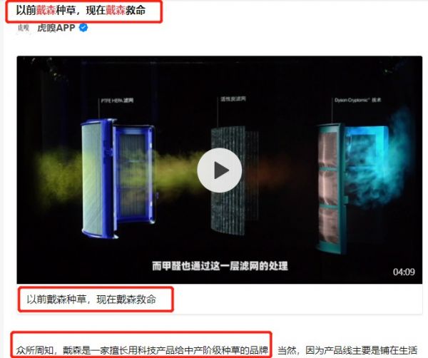 看看虎嗅的这篇教科书式科普,“戴森可以救命”,“戴森是一家擅长为中产阶级种草的品牌”。中产阶级还好,毕竟现在全知乎都这都这个词儿已经不是什么好话了,但是救命???
