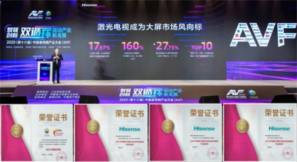 11月26日,由中国电子视像行业协会主办的2020第十六届中国音视频产业大会在北京召开。本次大会对今年以来表现卓越的新技术新产品进行了表彰,并颁发了代表着中国视像行业最高荣誉的科技创新奖和彩虹奖。海信激光电视100L9-PRO获得技术创新奖,海信ULED8K电视U9和社交电视S7F获得产品创新奖,海信激光显示研发团队技术带头人田有良荣获彩虹奖。