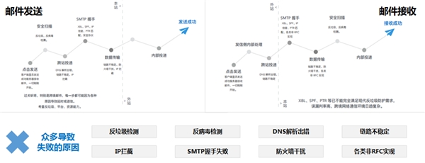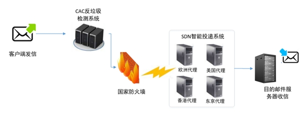 国内邮件投递通过国内的服务器投往国外的邮件服务器,需要经过多级跳转,同时受国内外网络影响,一旦网络不稳定,系统就会出现丢包,延迟等不稳定的邮件投递情况。