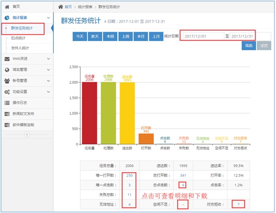 Rushmail有一个数据查询的系统设置,里面的模块叫做统计报表。统计报表里面有群发任务统计、扣点统计、发件人统计等等。相应的选项代表不同的功能,用户只要打开了列表,马上就会生成一个报表的形式,非常直观看到各种数据。这里数据完全根据实时发送情况生成,并且可以对多个任务进行比较,Rushmail这里只需要一键生成,数据早已经记录下来,让操作人员可以轻松看到。企业为此付出的成本就低了很多,节省了时间,提高了效率。