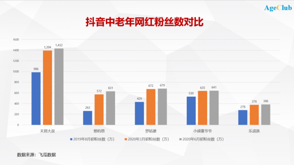 抖音也聚集了大量中老年网红,主打时尚穿搭的“末那大叔”(75岁)抖音粉丝近1400万,以日常生活分享为主的“我是田姥姥”(72岁)拥有2900万粉丝,“汪奶奶”还曾创下最高单场销售额537万元的直播带货记录,流量丝毫不输头部网红。