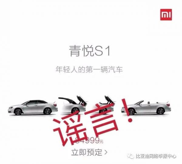 网上流传多组图片显示,“小米即将发布和比亚迪出品的‘年轻人的第一辆汽车’——青悦S1”。网传图片还显示,青悦S1是一款敞篷电动车,预定价84999元。