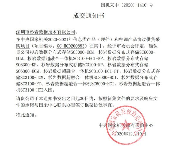 近日,中央国家机关2020-2021年信息类产品(硬件)和空调产品协议供货采购项目正式发布中标公告,杉岩数据旗下分布式存储、超融合一体机等12款产品成功入围此次采购名单。