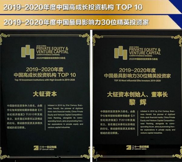 大钲资本名列2019-2020年度中国高成长投资机构Top 10,大钲资本董事长黎辉先生被评为2019-2020年度中国最具影响力30位精英投资家之一。