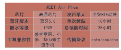 JEET Air Plus的配置在300-400元以内这个价位是可以算的上是顶配的了,芯片采用QCC3020芯片,还支持Aptx、AAC、SBC传输协议,音质采用全频HIFI动铁发声单元,提高了蓝牙传输的稳定性,音质高音更有有保障。
