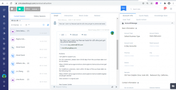 同频管理服务业务:销售易客服云与国际呼叫中心无缝集成 ,还支持邮件、IM、APP等众多沟通渠道,为全球客户提供无间断服务。同时支持Mail to Case,将客户邮件自动生成服务工单 ,结合工单分配流转规则,闭环管理客户诉求,且满足海外客户使用邮件沟通的习惯。从全渠道服务受理到现场上门服务,一站式闭环管理让全球客户更满意!