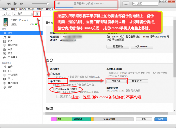 使用iTunes软件,依据下图把苹果手机上的全部数据备份到电脑上