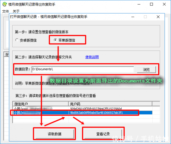 下载并打开“楼月微信聊天记录导出恢复助手”,然后点击“读取数据”,再在上方选择一个想读取的微信号,再点击“查看记录”按钮。
