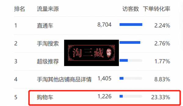 1 加购的商品转化率高:看这个数据就很明显,搜索流量、推荐流量的转化率都是个位数,而购物车可以做到高达23.33%,其实买家的购物意愿在加购时就已经植入了,只是时候未到。所以几乎所有类目从购物车来的流量转化会高很多。
