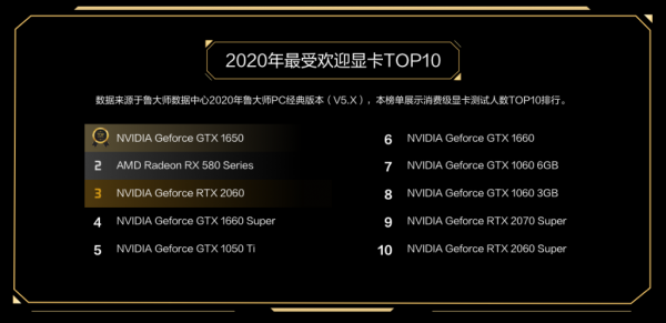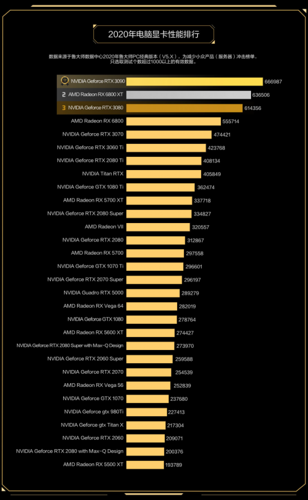 在显卡性能排行榜中,NVIDIA GeForce RTX 3090成功夺得该榜冠军,以压倒性优势超越AMD,并成为PC端年度最强显卡,是名副其实的旗舰GPU,鲁大师性能跑分高达66.7万分。NVIDIA 新发布的30系列显卡,在此次榜单排名也都获得了不错的成绩, RTX 3080、3070、3060ti分别获得第三、五、六名,整体看30系列要比AMD更有优势。