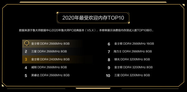 在最受欢迎内存排行榜中,金士顿DDR4 2666MHz 8GB成为本次冠军,并且前三甲有两款都是金士顿旗下产品,可以说是力压三星、威刚等品牌。