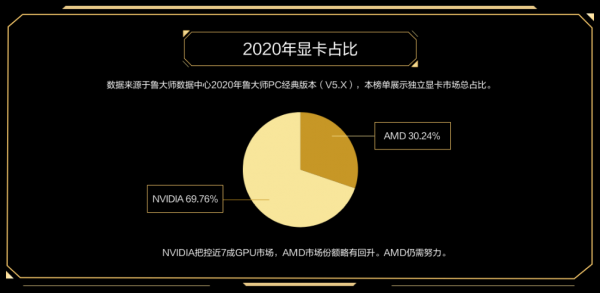 在显卡品牌市场占比排行榜中,可以直观的看出,AMD市场份额仅有30.24%,而NVIDIA 市场份额高达69.76%,几乎占据了GPU近七成的市场。而AMD市场份额稍有提升。