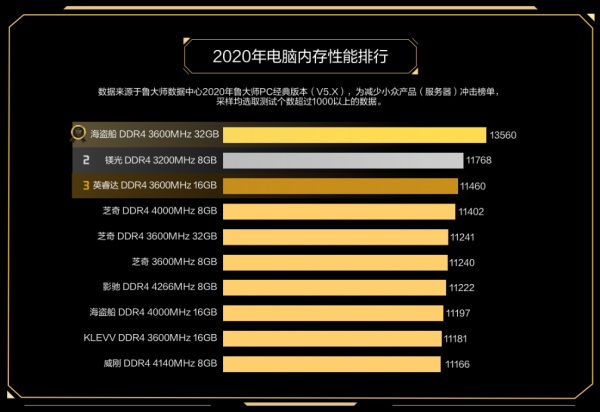 在鲁大师2020年度报告内存排行榜中,海盗船 DDR4 3600MHz 32GB荣获牛角尖最强内存,成为2020年度PC端最强的内存硬件。在电脑配件全面RGB化的今天,如何避免同质化,成了摆在各个厂商面前的一个难题。海盗船通过不断完善自身产品性能,才能让自己的产品能在众多对手当中脱颖而出。而镁光、英睿达在此次榜单中也获得了不错的成绩。芝奇虽没有进入前三强,但一上榜就连续占据该榜四、五、六名,这样的成绩也不容小觑。