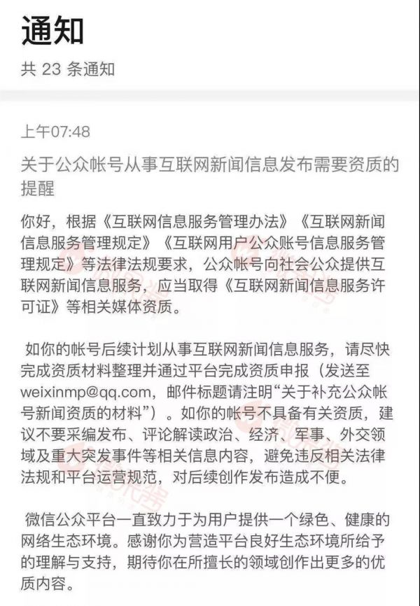 今天一早,不少运营者向微果酱爆料称,公众号后台收到了《关于公众账号从事互联网新闻信息发布需要资质的提醒》通知。