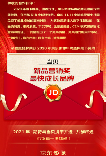 当贝科技各类智能硬件产品荣获京东电脑数码 以及京东影像新品营销奖 最快成长品牌,以及行业机构认可赞誉,不仅是京东与当贝科技品牌厂商携手并进的见证,更是就产品创新、供应链升级、营销战略、流量运营等多个层面对未来电脑数码行业前行方向进一步启发。相信在京东与当贝科技品牌厂商的共同努力下,在2021年以及未来里当贝科技品牌将始终如一以全新优质的产品、更好的服务、更优的价格为亿万用户打造全新的智能家居大屏体验。京东与当贝一同携手向前共造美好再创辉煌!未来可期!一起加油!继续有目标的努力前行!