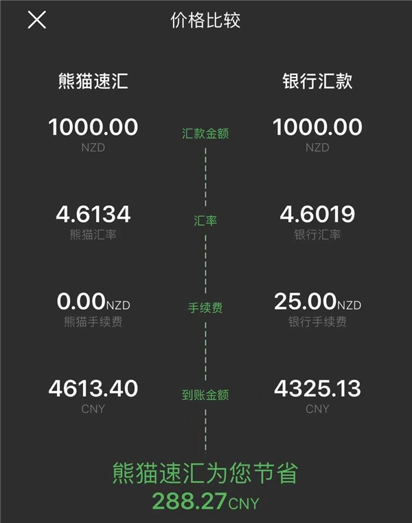熊猫速汇追求更优全市场汇率报价,全程线上操作,没有线下成本;熊猫速汇时刻为用户谋福利,将汇款服务落到实处,单笔手续费低至5.99NZD!(悄悄透露 新用户首笔还免手续费!)