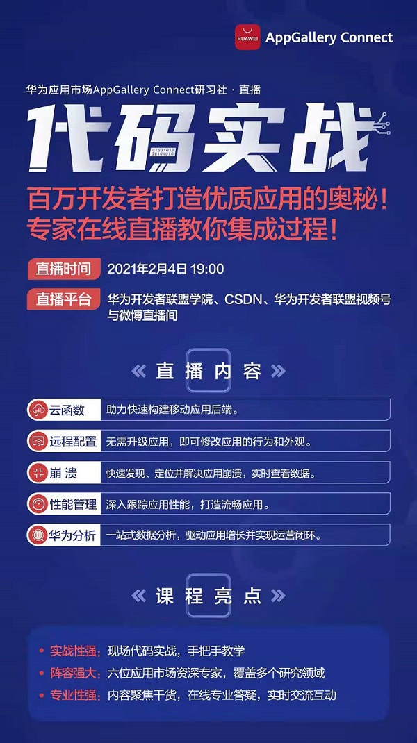 2月4日19点,华为应用市场AppGallery Connect专家团队将在线为大家带来丰富干货解读:涵盖云函数、远程配置、崩溃服务、性能管理、华为分析5个单服务,帮助开发者提升应用质量与开发效率。