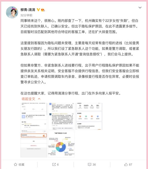 滴滴出行总裁柳青回应“杭州22岁女性失联”事件:杭州确实有个22岁女性“失联”,但白天已经找到失联人,已确认安全。目前暂时没匹配到其他符合特征的客服工单,还在扩大排查范围。