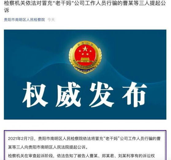 A5创业网(公众号:iadmin5)2月7日报道:贵阳市南明区人民检察院依法将冒充“老干妈”公司工作人员行骗的曹某等三人向贵阳市南明区人民法院提起公诉。