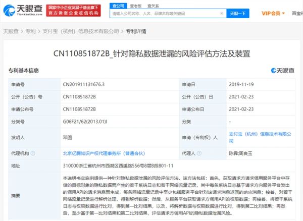 据天眼查资料显示,支付宝(杭州)信息技术有限公司今天公开了关于“ 针对隐私数据泄漏的风险评估方法及装置”专利信息,公开号为CN110851872B。