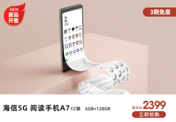 海信5G阅读手机A7是海信最新一代的护眼阅读产品,同时也是行业内首个支持5G制式的水墨屏手机。该机创造性的将水墨屏与5G网络相结合,并在硬件及软件方面进行了全方位升级,在5G时代为消费者带来随时随地的护眼阅读体验。