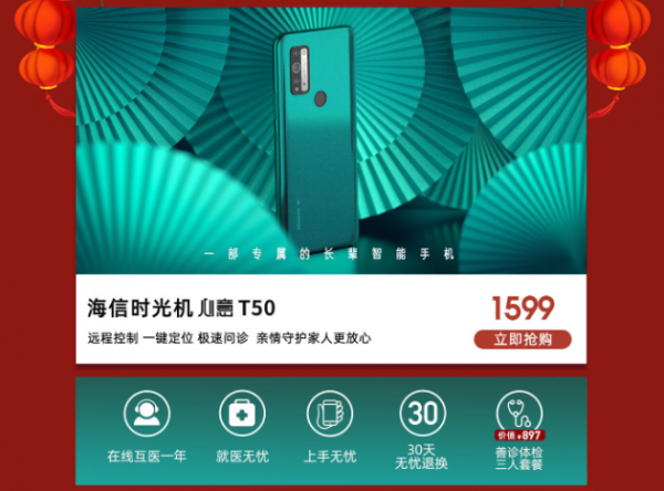 现在购买海信5G手机心意T50,可享受在线互医一年、就医无忧、上手无忧、30天无忧退换、善珍体验三人套餐等多重权益。