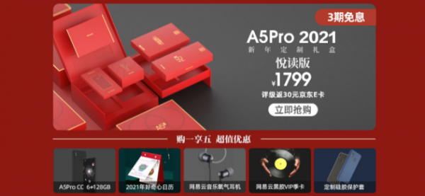 活动期间,购买海信阅读手机A5 Pro CC版/经典版,可享受3期白条免息服务。购买海信阅读手机A5 Pro新年定制礼盒,除了可以享受3期白条免息服务之外,还可享受“购一享五”的超值优惠。