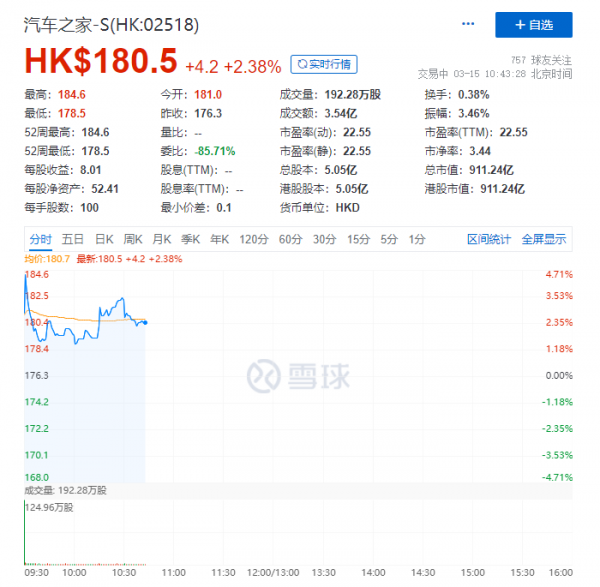 A5创业网(公众号:iadmin5)3月15日报道:今日,汽车之家正式登陆港交所。截至发稿时,汽车之家上涨2.38%,盘中股价达180.5港元,市值达911.24亿港元,约合人民币 765亿元。