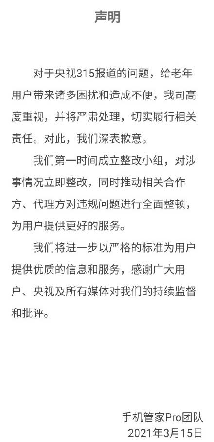 手机管家Pro团队表示,对于央视315报道的问题,给老年用户带来诸多困扰和造成不便,我司高度重视,并将严肃处理,切实履行相关责。对此,我们深表歉意。