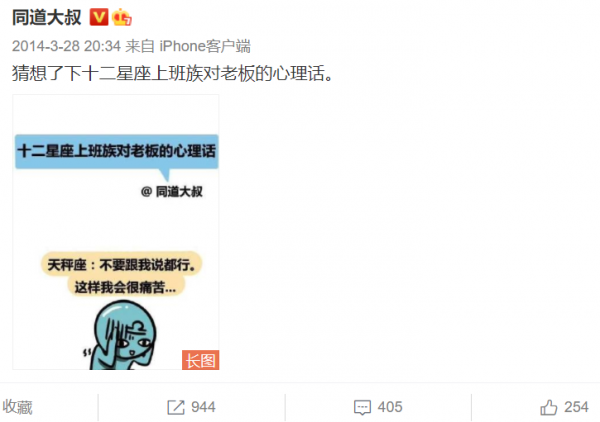 到了2014年3月份,一条“十二星座上班族对老板的心里话”转评赞的数据都比平时要高。