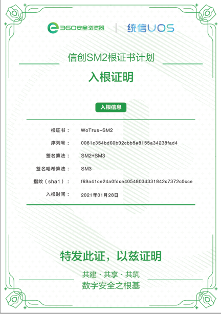 沃通“国密SM2根证书” 借助此次入根360信创SM2根证书库 ,也将同步在360安全浏览器V10.4.1005.33(信创版)、统信UOS操作系统 进行预置和维护,沃通“国密SM2根证书”下签发的各类国密数字证书可自动获得信任。至此,沃通“国密SM2根证书”已经全面兼容主流国密浏览器、国内主要操作系统以及国产网络安全设备 ,成为目前兼容性最为广泛、适配能力最强 的国密顶级根证书。