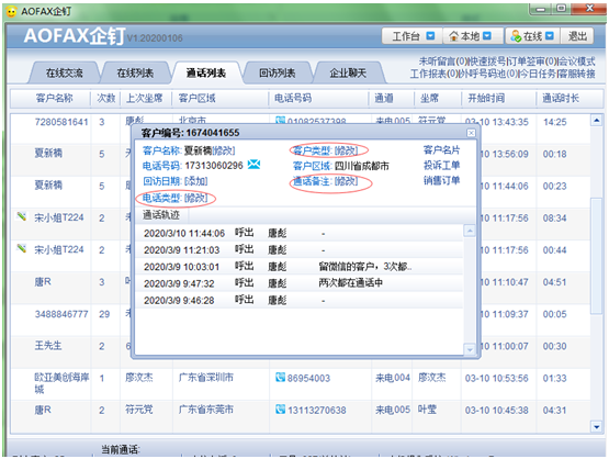 点击客户名称可查看客户详情和历史对话轨迹,咨询师可对每次对话添加备注说明,方便在下次来电咨询时自动显示历史沟通情况,有利后续服务。