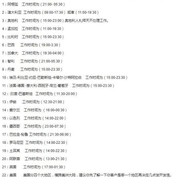 以下的时间都是按照中国时间列出的部分国家的工作时间: