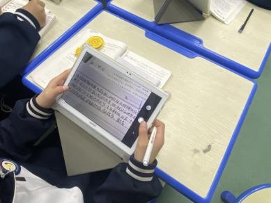 3月24日上午7点40分,项老师的语文课正式开始。本节课的主题是“爱国”,课中项老师通过易课堂的抽选和抢答功能与同学们积极互动,让同学们主动分享自己知道的爱国事例,通过拍照上传的方式收集学生的预习作业(爱国的诗词),并进行大屏展示,让同学们起来诵读,课堂气氛十分活跃。在课堂小结时,项老师将提前准备好的课堂任务推送给学生,让其在平板上完成课堂作业,而项老师在教师端能够实时了解学生的作业完成情况。