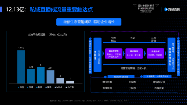 “企业直播是重要的流量触达点,背后逻辑还是要运营好私域流量。”周鹏鹏认为月活量12.13亿的微信是培育企业私域的好土壤,比起抖音快手这样的公域直播平台,微信更适合搭建可沉淀、可识别的流量池,建立引流触达-互动激活-二次营销的完整私域生态链,助力企业品牌力提升。