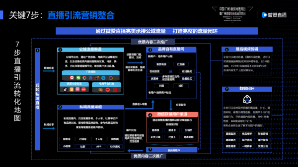 现场,周鹏鹏分享了微赞直播绘制的7步直播引流转化地图,涵盖行业活动、教育培训、电商带货、品牌宣传、医疗应用、企业综合服务等多个场景,清晰展示企业私域流量走向及运营办法。周鹏鹏提到,接下来的企业直播场景将向“直播+”延伸,以用户为核心的直播会成为日常的一部分,长效ROI对品牌效益显得尤为重要。