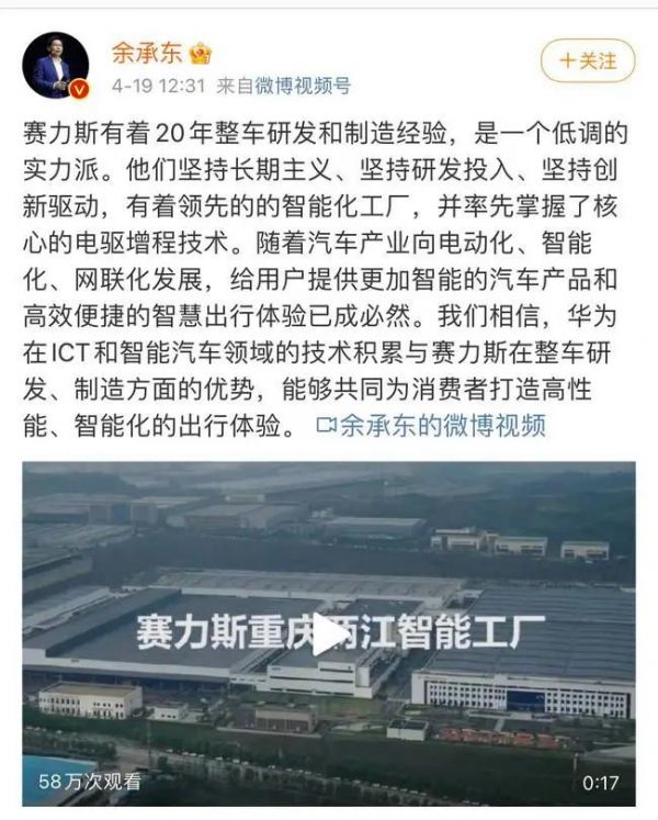 从余承东连发数条微博力赞赛力斯可以看出华为选择赛力斯作为合作伙伴的深刻原因。